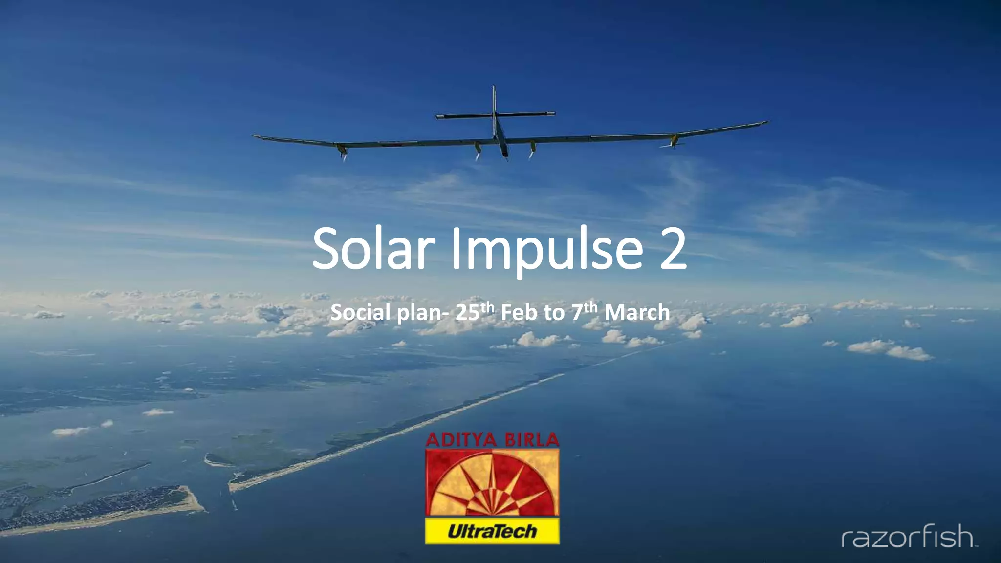 This document outlines UltraTech's social media plan to promote Solar Impulse 2's (SI2) journey landing in India from February 25th to March 7th. The plan includes creating buzz about SI2's history, engaging audiences with facts and quizzes, and posting updates during its landing in Ahmedabad and other Indian cities. Posts will highlight SI2's technological achievements and inspire support for sustainable innovations. The overarching goal is to generate excitement for SI2's mission and promote UltraTech's commitment to environmental protection.