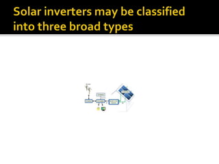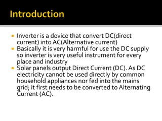 An inverter converts direct current (DC) from a solar panel into alternating current (AC) that can power household appliances and be fed into the electric grid. There are different types of inverters - string inverters connect multiple solar panels in series, microinverters convert power from individual panels, and central inverters are large units used for large commercial arrays. Inverters use maximum power point tracking technology to optimize power output from solar panels and may include additional functions like battery charging. Grid-tied inverters synchronize with utility power while off-grid inverters operate independently without grid connection.