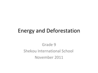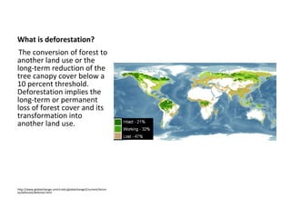 The document discusses the causes and impacts of deforestation through the example of Haiti. It notes that deforestation involves the long-term loss of forest cover and its conversion to other land uses. In Haiti, a poor country, people rely heavily on fuel wood for cooking and heating due to lack of alternatives, using an estimated 4 million tons of wood annually. The document proposes solar ovens as a potential alternative to fuel wood to help address deforestation.
