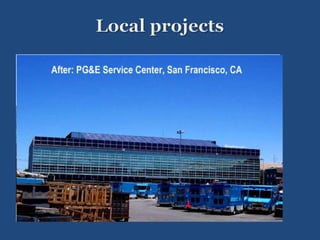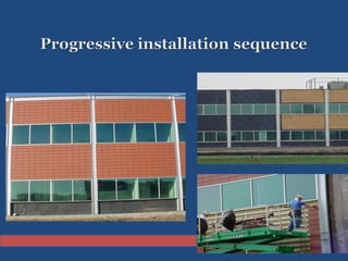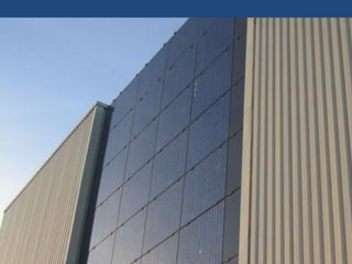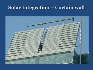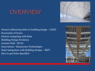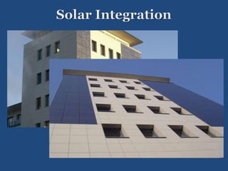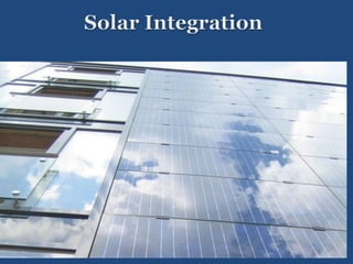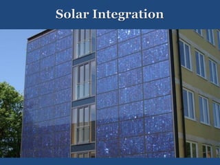 The document discusses solar integration with building design. It provides examples of how solar panels were used to renovate the facade of a 40-year-old tower in Manchester, creating the largest vertical solar array in Europe. The solar panels generated enough power for 55 homes annually while weatherproofing and updating the building. The document argues that sustainable design should integrate trades like rainscreen technology and solar power. Specifiers need to work with architects and owners to specify these integrated solar and energy-efficient systems.