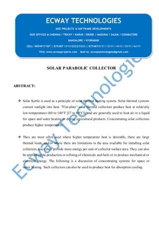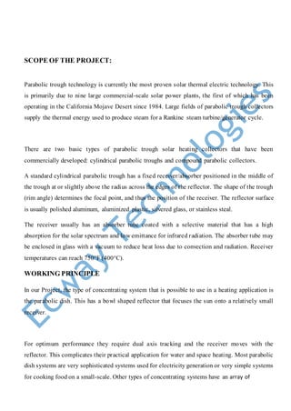 The document discusses solar parabolic collectors, specifically cylindrical parabolic trough collectors. These collectors use curved reflectors to concentrate sunlight onto an absorber tube to produce high temperatures. The absorber tube is coated to absorb solar energy and emit little infrared radiation. Parabolic trough technology is currently the most proven solar thermal electric technology, with nine large commercial plants operating since 1984 to produce steam for electricity generation. The document also discusses parabolic dish collectors which focus sunlight onto a small receiver but require dual-axis tracking.