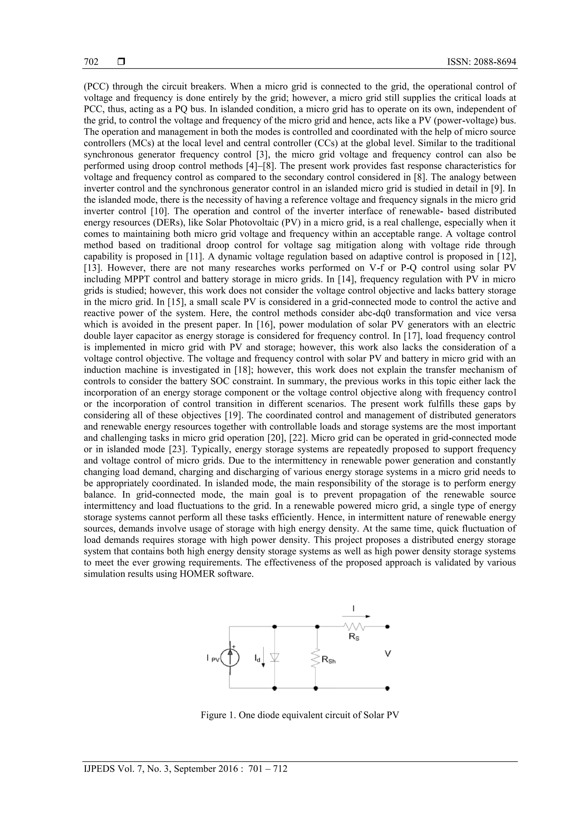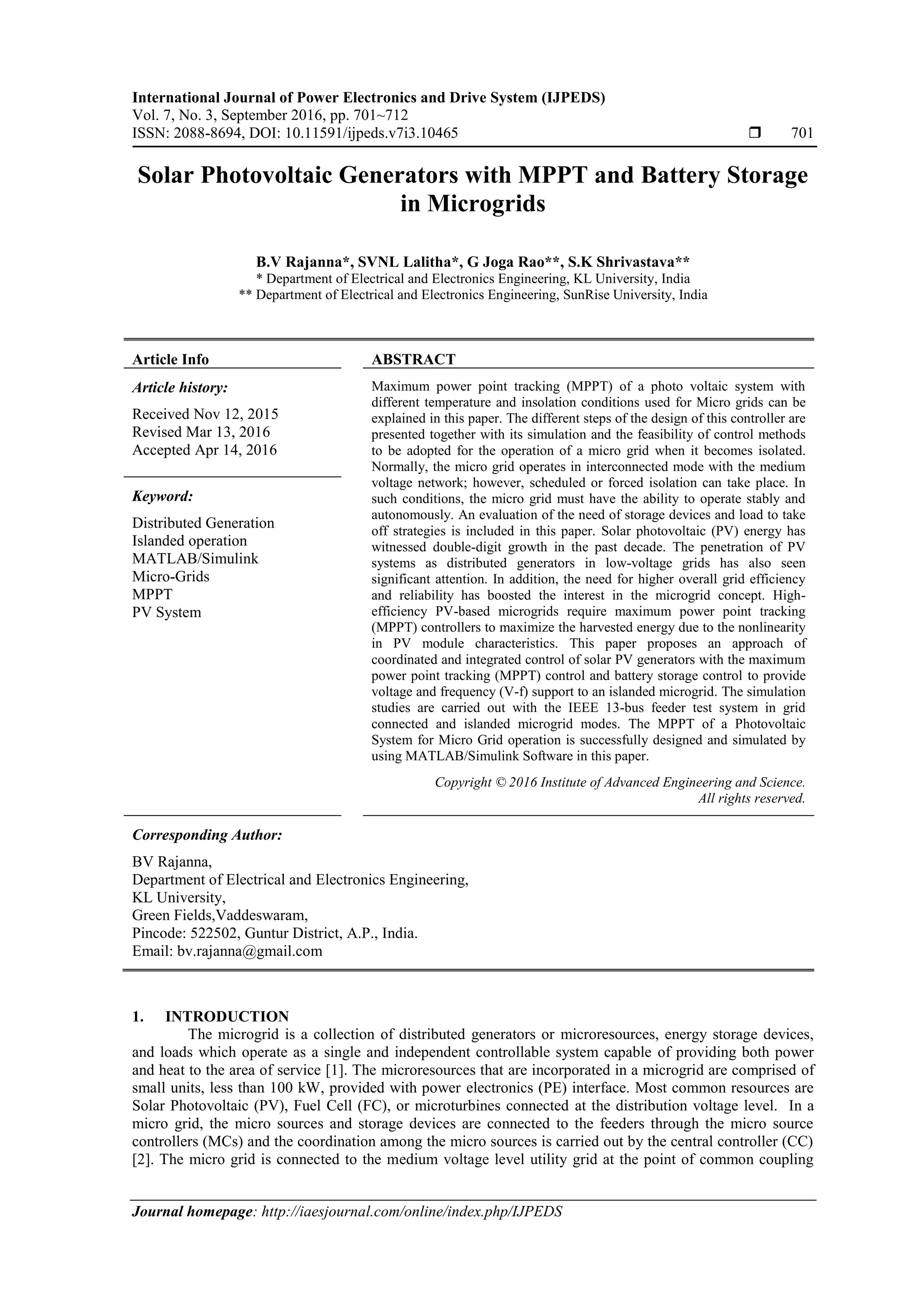 The paper discusses the design and simulation of a maximum power point tracking (MPPT) system integrated with battery storage for solar photovoltaic generators in microgrids. It highlights the challenges and importance of voltage and frequency control in islanded operations and proposes solutions to ensure stable and autonomous microgrid functioning. The effectiveness of the proposed methods is validated through simulation studies using MATLAB/Simulink and the IEEE 13-bus feeder test system.