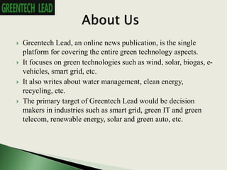 Greentech Lead is an online news publication dedicated to covering the entire spectrum of green technologies, including solar, wind, and e-vehicles. It targets decision makers in related industries and provides timely market analyses, news, and updates on renewable energy developments. The platform also focuses on clean energy, recycling, and water management, featuring various articles on significant projects and policies in the greentech sector.