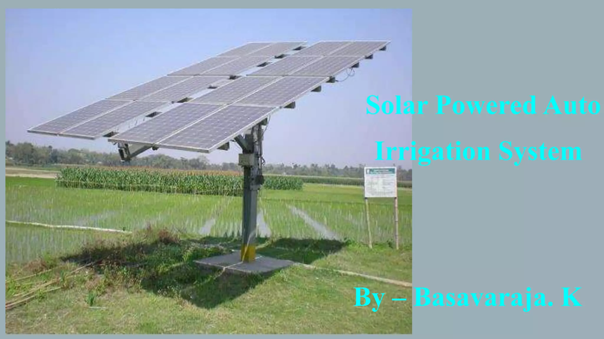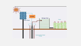 This document summarizes a solar powered automatic irrigation system for farmers. The key components are a solar panel to generate power, batteries to store the power, a water pump to pump water from a bore well to an overhead tank, and an automatic irrigation module using a moisture sensor. This module senses the soil moisture level and controls the water flow to irrigate the fields and optimize water usage. The system is self-starting and requires minimal maintenance as it uses solar power as a renewable energy source. It provides farmers with a cost-effective and environmentally friendly alternative to grid-connected electricity for irrigation.