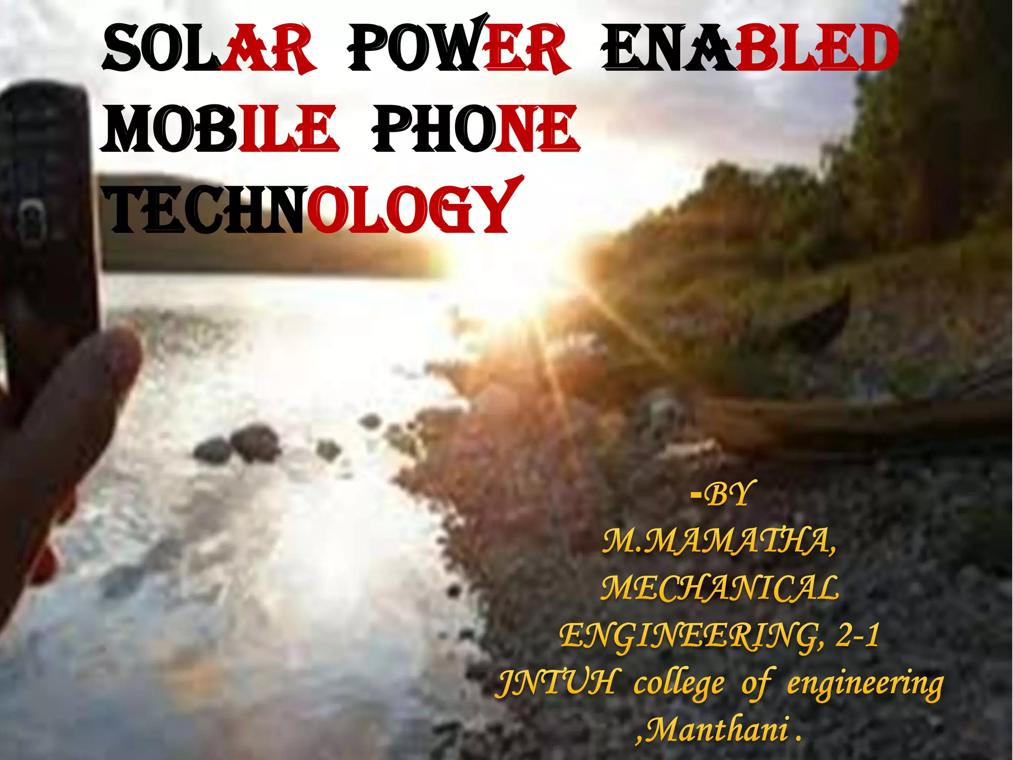 Solar powered mobile phones are able to charge using sunlight by integrating solar cells and panels. The first solar phone was invented in 2007 and had solar panels that trickle charged the battery, extending its life by 2.5 times. Solar mobile phones provide a sustainable option as they can charge in any light condition without needing electricity, making them particularly useful in rural areas. New technologies are exploring transparent, flexible solar screens built into displays to charge phones without needing separate panels.