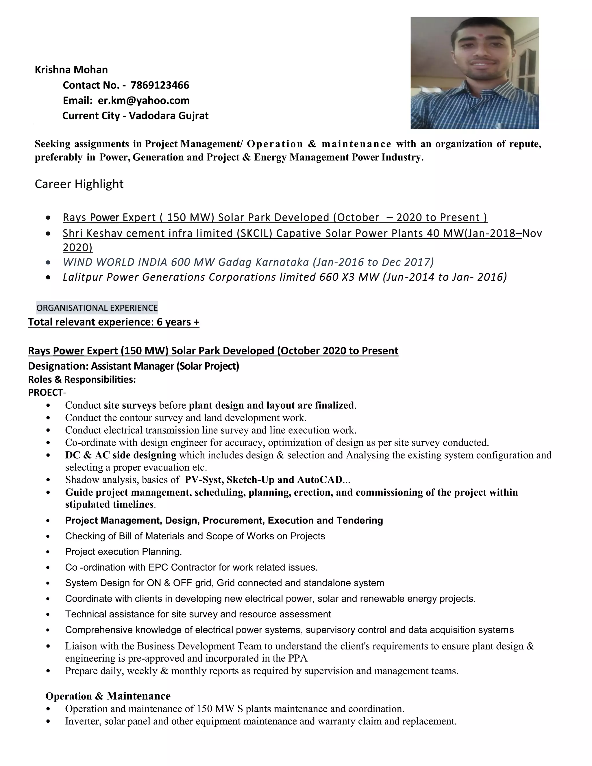 Krishna Mohan is seeking assignments in project management or operations and maintenance in the power industry, preferably related to power generation, project management, or energy management. He has over 6 years of experience working on solar and wind power projects totaling over 1,250 MW in capacity. His experience includes project design, procurement, execution, commissioning, and operations and maintenance. He is currently working as an Assistant Manager on the development of a 150 MW solar park project in Vadodara, Gujarat.