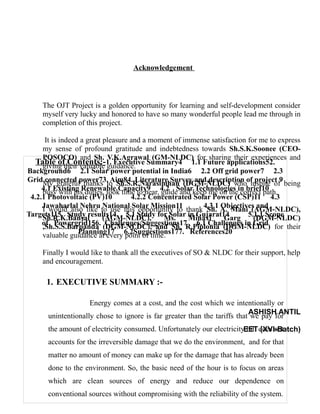 This document discusses solar power integration with the power grid in India. It provides background on solar power potential and capacity in India. The government has set targets to significantly increase solar capacity through the 12th five-year plan, with a total capacity addition of over 9 GW. Integrating this additional solar power presents challenges for grid operators due to the variable nature of solar power production. The document aims to analyze issues around grid integration of solar power in India and provide suggestions to overcome these challenges.