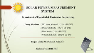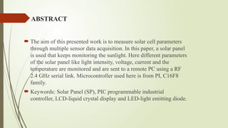 The document presents a project aimed at creating a solar energy measurement system to monitor solar cell parameters such as voltage, current, temperature, and light intensity using multiple sensors. Data from the system is displayed on an LCD and sent to a remote PC via a 2.4 GHz serial link, utilizing a PIC microcontroller for data acquisition. The project also details the functioning of the temperature and light sensors, as well as the methods used for voltage measurement in solar panels.