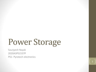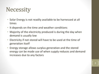 The document discusses various methods for power storage, highlighting the necessity of energy storage for solar power due to its dependence on time and weather. It covers different storage technologies, with a focus on batteries—particularly lead-acid and lithium-ion—along with specifications and safety characteristics. Additionally, it addresses the challenges faced by electric vehicles in terms of cost and driving range, and the potential of gallium nitride technology to enhance efficiency and fast charging.