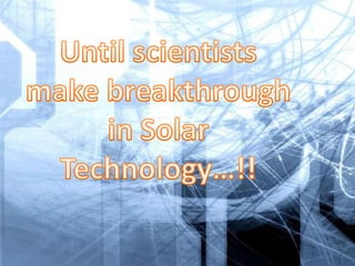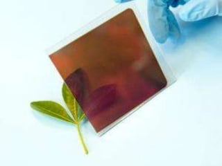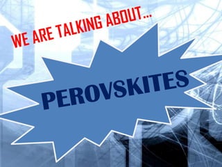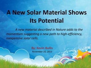 The document discusses the potential of a new solar cell material called perovskite. Perovskite solar cells can be produced at low cost using simple solution-based methods. Research suggests perovskite solar cells could eventually reach efficiencies over 20%, comparable to existing thin-film technologies. Perovskite absorbs light strongly and transports electrical charges well. Its properties may allow solar cells that convert over half of sunlight to electricity. Researchers are working to improve efficiency and stability through material modifications. Perovskite solar cells could eventually lead to much lower cost solar power compared to current technologies.