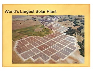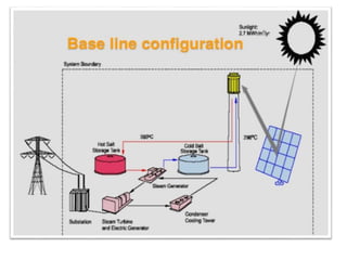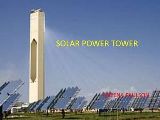 Solar power towers use an array of mirrors called heliostats to focus sunlight onto a central receiver at the top of a tower. This concentrated sunlight is used to heat a fluid or molten salt that can store the thermal energy. There are two main types of solar towers - steam based systems that use water as the heat transfer fluid, and molten salt based systems that use a molten salt mixture. Solar towers have the advantages of being renewable, environmentally friendly sources of energy generation, but they also require large amounts of land and water and have the disadvantage of only producing energy when the sun is shining.