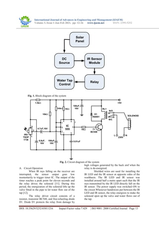 This document presents the development of a solar-powered automatic wash hand basin system designed to reduce water wastage and prevent cross-contamination, especially during the COVID-19 pandemic. The sensor-based system activates water flow when hands are detected below the tap, improving hygiene and conserving resources. The project highlights advantages such as low cost, easy installation, and energy efficiency, while acknowledging challenges like the need for a reliable power supply.