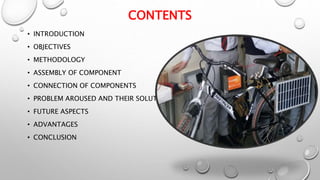 This document describes a solar powered bicycle. It includes sections on the objectives of creating a solar powered bicycle, the methodology used including assembling the components and connecting them, issues that arose and their solutions, and future aspects and advantages. The key components are a 500W DC motor, solar panels that charge lead acid batteries, and a chain drive system to connect the motor to the rear wheel. The goals are to power the bicycle using solar energy to reduce human effort for transportation over short distances.