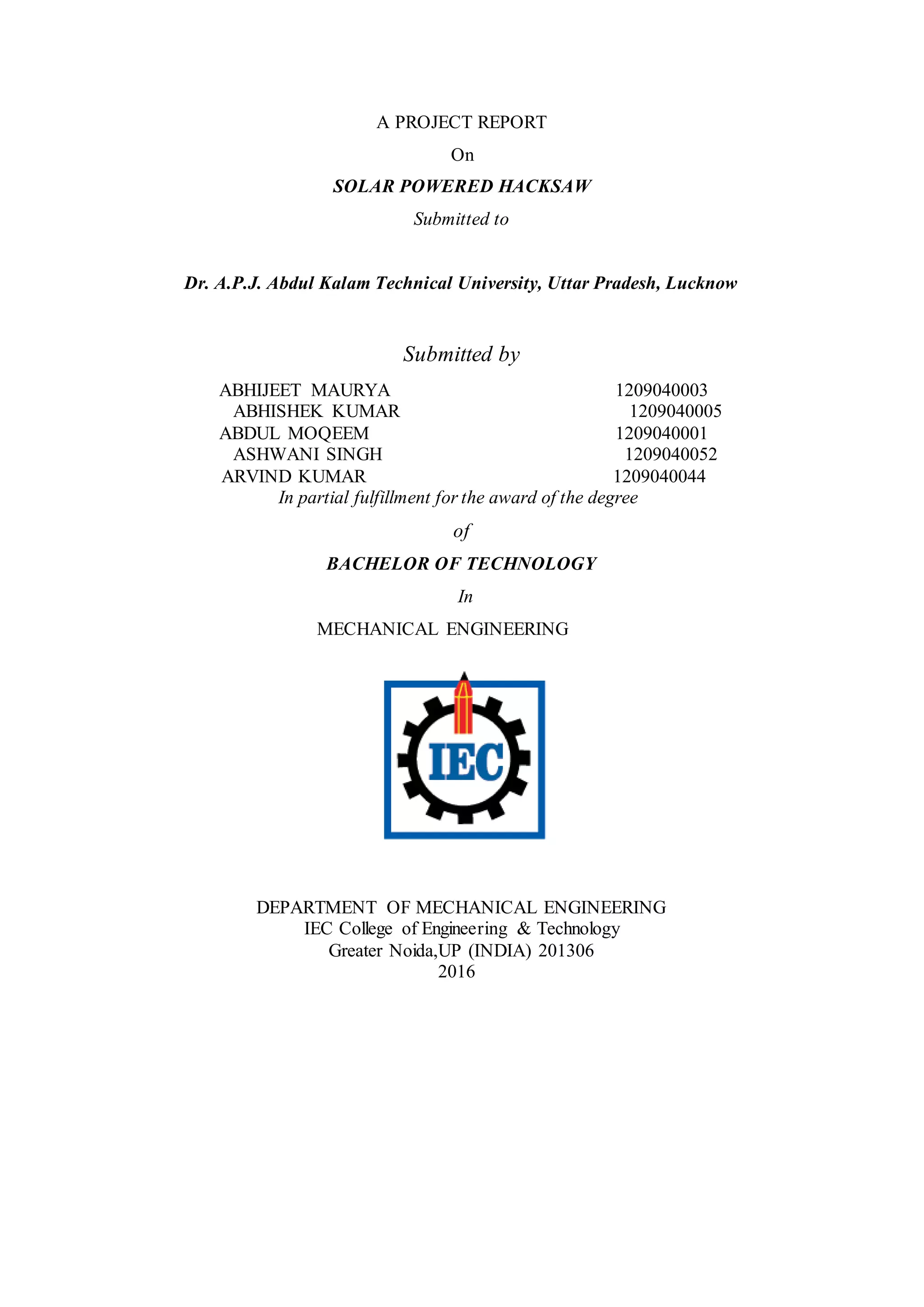 The document is a project report on the design and construction of a solar-powered hacksaw machine aimed at enhancing efficiency in cutting metals. It discusses the methodology, components, and operation of the machine, highlighting its environmental benefits and reduction in manual labor. The report also includes acknowledgments, literature reviews, and key objectives regarding sustainable manufacturing practices.
