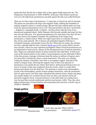 Solar prominences are huge loops of solar material that extend outward from the sun's surface. They can be several miles wide and tall. Prominences form over timescales of about a day and contain cooler plasma than the corona, appearing as bright features against the dark sky. The largest prominence observed was over 350,000 km long. Prominences are anchored in the photosphere by magnetic fields and supported against gravity, existing at boundaries between magnetic polarities. They can persist in the corona for several months before erupting.