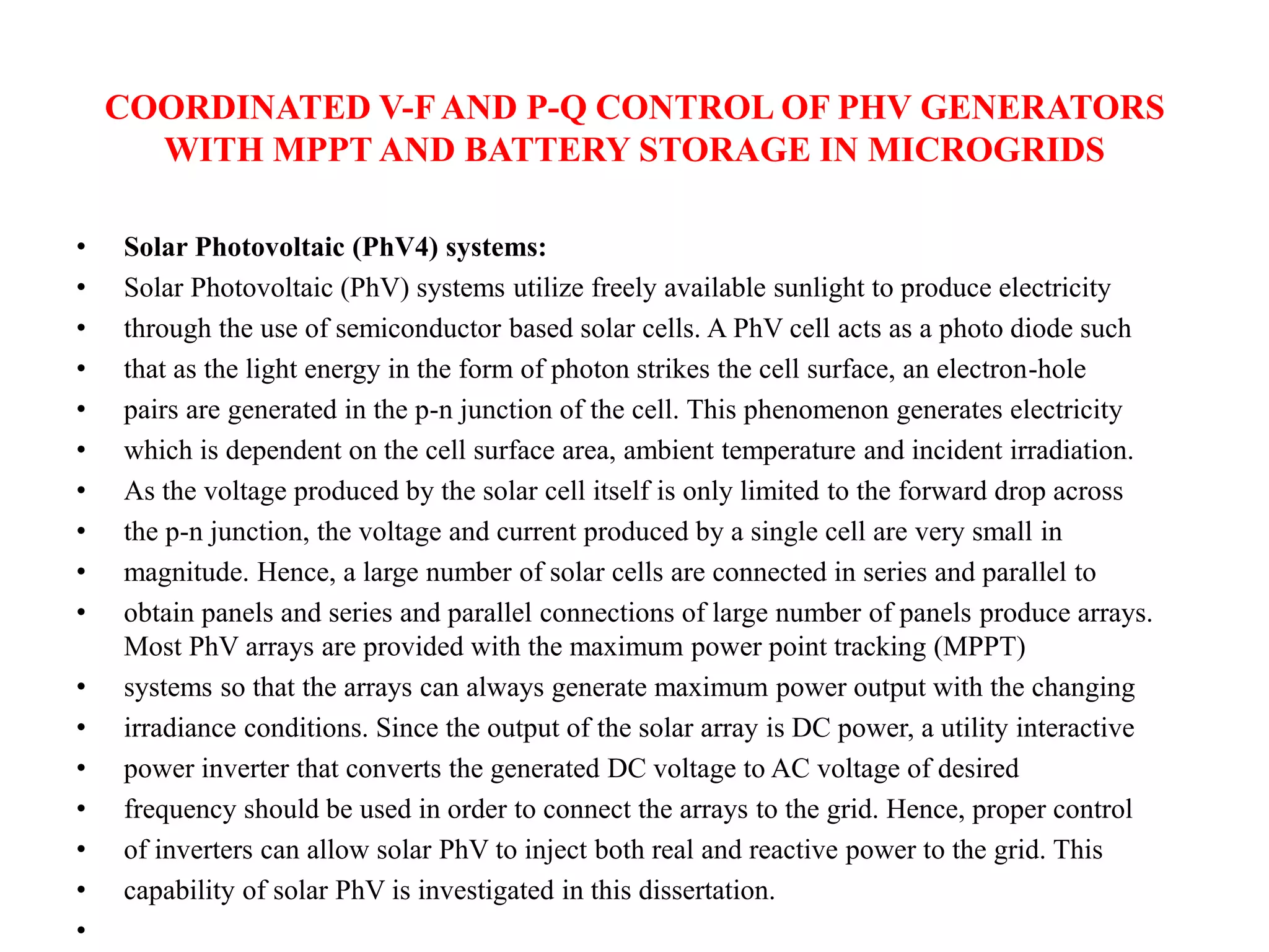 This document discusses coordinated voltage-frequency (V-f) and active-reactive power (P-Q) control of photovoltaic (PV) generators with maximum power point tracking (MPPT) and battery storage in microgrids. It describes the configuration of a PV system connected to a microgrid through an inverter, including an MPPT boost converter and a battery connected via a bi-directional DC-DC converter. The control system utilizes four loops - one for MPPT control, two for V-f control at the inverter, and one for battery power management. The control algorithms are demonstrated on a single PV generator but could be applied to coordinate multiple generators in future distribution systems.