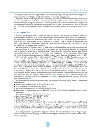This document discusses the use of power electronics in solar photovoltaic systems in India. It provides background on India's growing installed solar capacity, currently at 2.5 GW, and the role of the National Solar Mission in facilitating solar development. The document outlines different types of solar PV systems and how power electronics are used in areas like inverters and maximum power point tracking to improve efficiency. It also discusses challenges like partial panel shading and the potential of net metering systems.