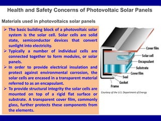 The document discusses health and safety concerns regarding photovoltaic solar panels. It describes the typical materials used in solar panels like solar cells made of semiconductors that convert sunlight to electricity. It also outlines potential hazards during manufacturing like exposure to toxic chemicals and heavy metals as well as disposal concerns. The document recommends implementing an occupational health and safety management system to manage risks, conduct hazard assessments, provide trainings, and continually improve safety performance and culture for the solar photovoltaic technology industry.