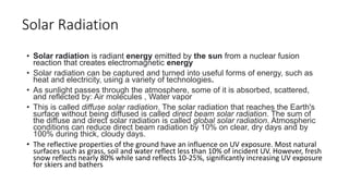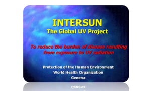 The document discusses solar radiation, its types, and its dual impact on human health, highlighting both adverse effects like skin cancers and cataracts, as well as beneficial effects such as Vitamin D synthesis. It emphasizes the importance of moderation in sun exposure, the role of the Global Solar UV Index, and protective measures to mitigate risks. Additionally, it outlines the objectives of the Intersun project aimed at researching UV exposure effects and promoting public awareness.