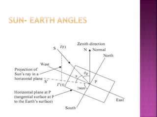 The document defines sunshine as direct sunlight of at least 120 w/m2 measured on the ground. It provides details on the sun's composition and radiation, including that 53.12% of its energy is in the infrared region. It also discusses how the Earth reflects 1/3 of sunlight and is inclined at 23.5 degrees on its axis. Finally, it describes various instruments used to measure solar radiation, including pyranometers and pyrheliometers, and concepts like beam radiation, diffuse radiation, and solar declination.