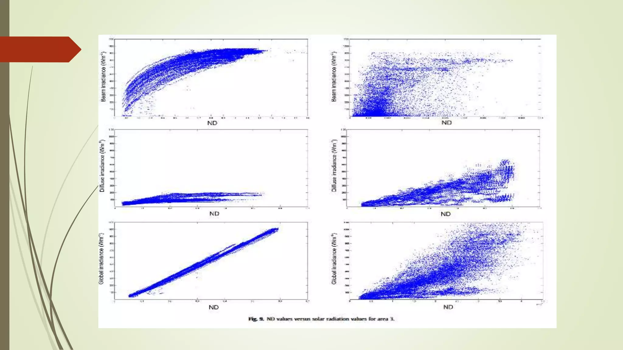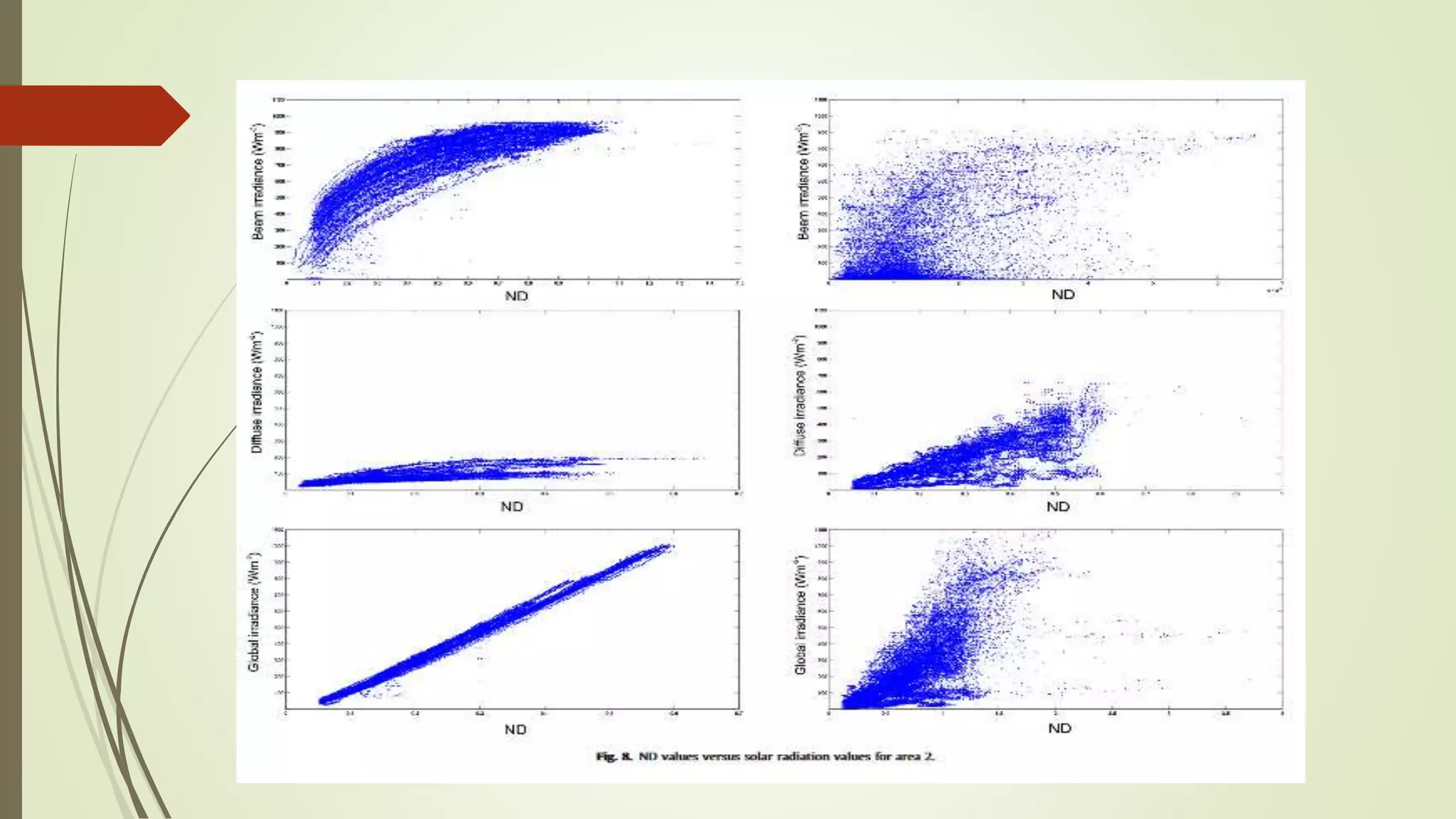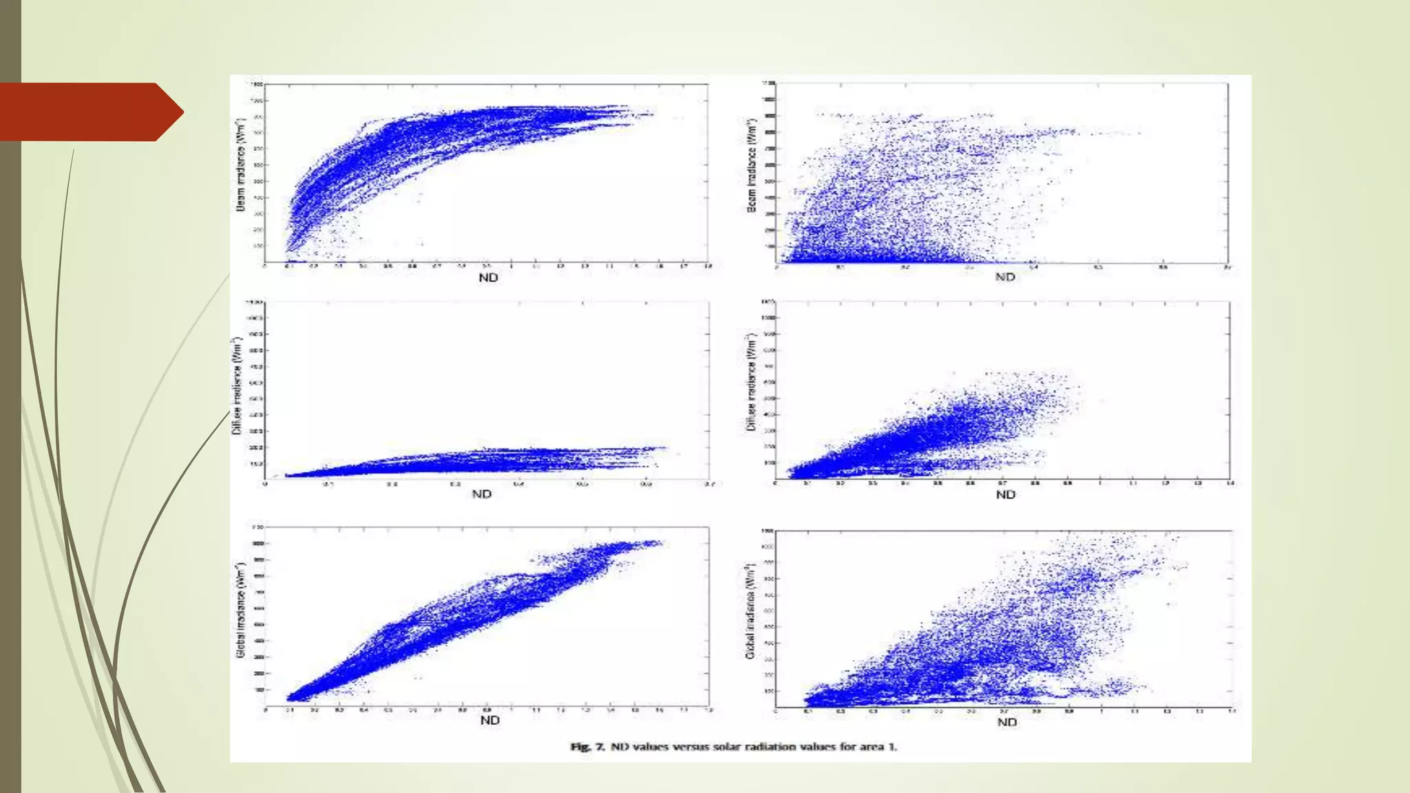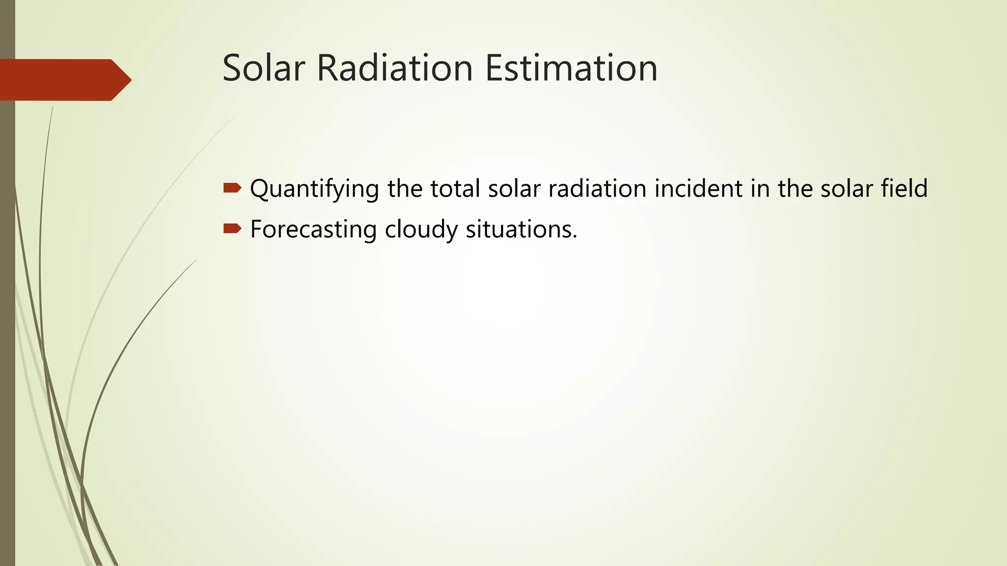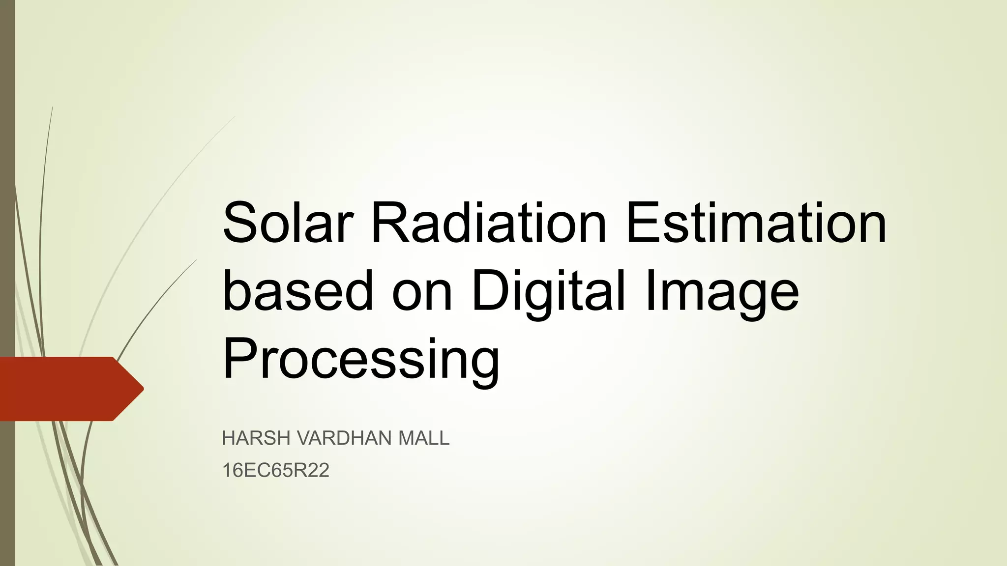 This document discusses a method for estimating solar radiation using digital image processing of sky camera images. Sky camera images are divided into three areas and pixel values from clear and cloudy day images are analyzed. Correlations between pixel values and solar altitude are used to create databases for clear and cloudy conditions. Beam, diffuse, and global radiation values are estimated based on averages of pixel values from the three areas and compared to measured values, achieving reasonably low error rates. The method provides information that can improve solar plant performance and operation based on meteorological conditions.