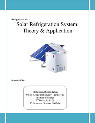 This document provides an overview of solar refrigeration systems. It discusses the basic principles of refrigeration using the vapor compression cycle. It then explains how solar energy can be used to power refrigeration through photovoltaic, solar thermal, or absorption refrigeration systems. The key components and operating principles of each solar refrigeration method are described, including diagrams of typical system layouts. Design considerations for matching the solar energy collection and storage to the refrigeration system requirements are also covered.