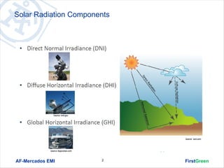 The document focuses on solar resource assessment techniques, emphasizing land-based measurements using thermal pyranometers and silicon sensors to assess solar radiation components in India. It highlights the significance of on-site monitoring for accurately estimating a project's energy potential and details the various data sources and validation processes involved. Additionally, it discusses typical solar irradiation metrics for locations like Chennai and suggests short-term data monitoring to enhance long-term predictions.