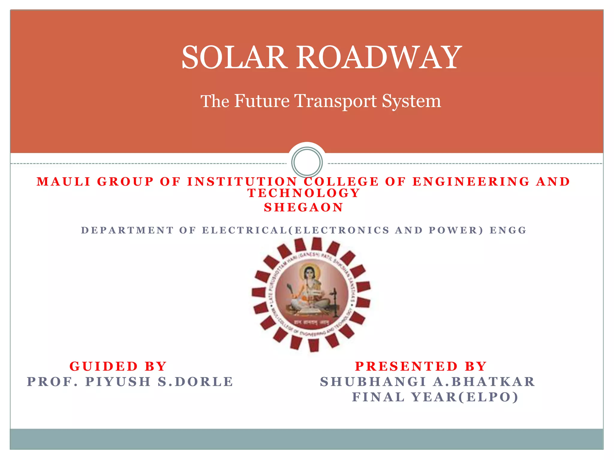 This document discusses the concept of solar roadways, which embed solar panels and LED lights below a tough glass surface to generate electricity and illuminate roads. A solar roadway consists of a glass top layer, an electronic layer containing photovoltaic cells and controls, and a base plate layer that distributes power. Solar roadways could power electric vehicles through induction charging and provide an intelligent transportation system by programming LED lights. While maintenance costs are a concern, solar roadways could meet a significant portion of India's electricity needs if implemented nationwide and reduce dependence on fossil fuels.
