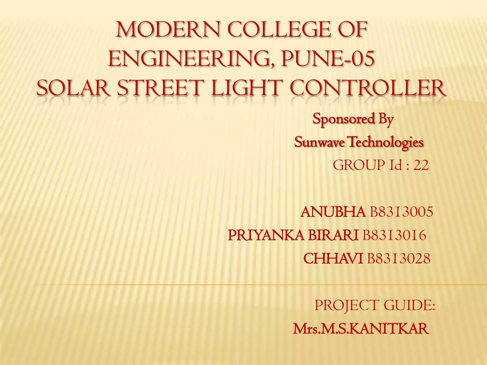 The document outlines a project at the Modern College of Engineering to develop a solar street light controller aimed at optimizing solar energy use, conserving mains power, and enabling wireless monitoring of street lights. It discusses the system components, including various lighting technologies and communication systems, alongside advantages like reduced CO2 emissions and energy efficiency. Future enhancements include implementing a solar tracking system and GPRS for real-time data transmission.