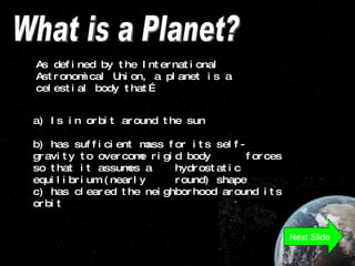 The document defines planets, dwarf planets, and plutoids. Planets orbit the sun, are round in shape, and have cleared their orbit. Dwarf planets also orbit the sun and are round, but have not cleared their orbit. Plutoids are dwarf planets found beyond Neptune's orbit. Examples are provided of Earth being a planet and Pluto being a dwarf planet, while Ceres is not a plutoid.