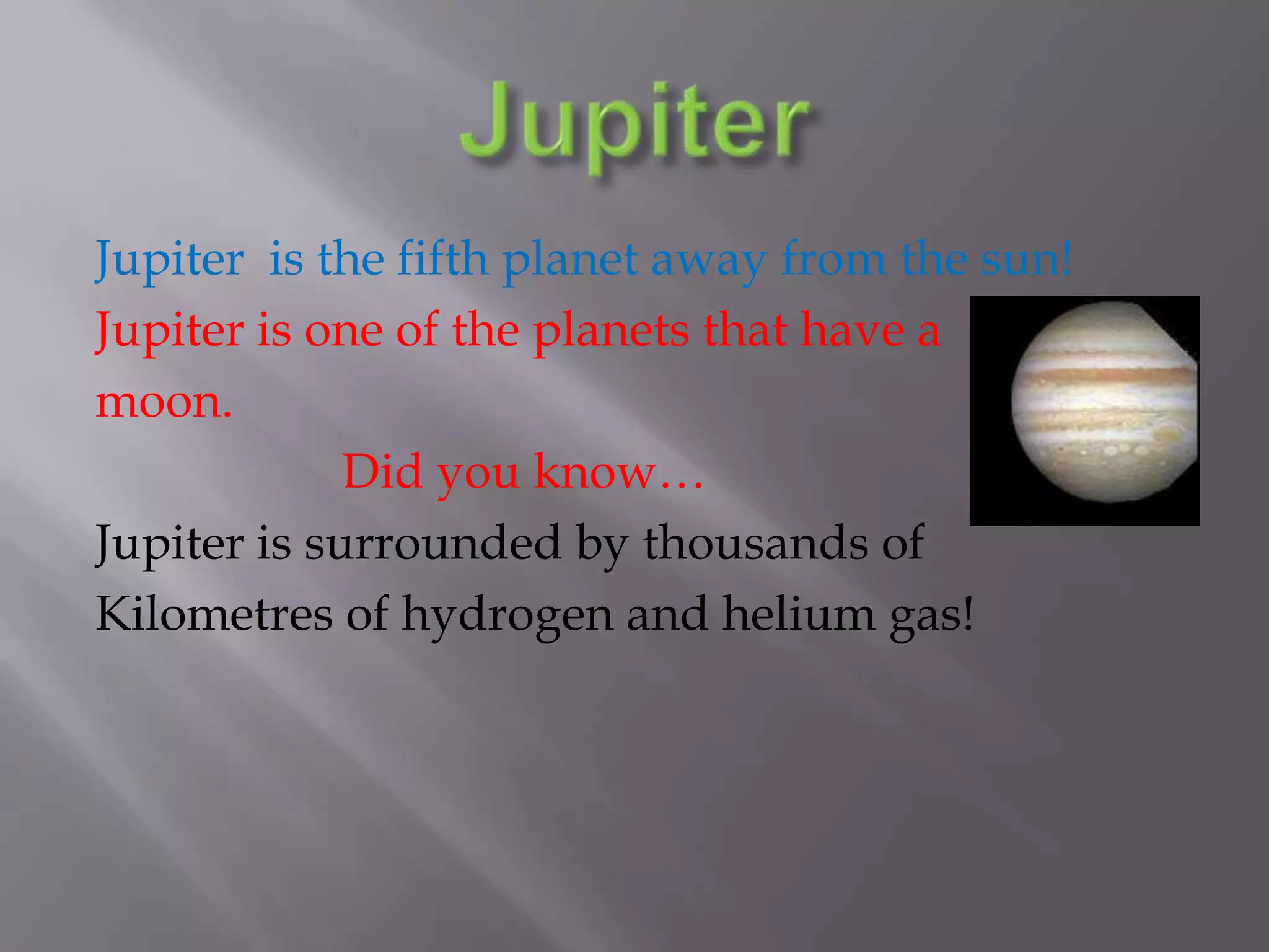 Jupiter is the fifth planet from the sun and has many moons. It is surrounded by thousands of kilometers of hydrogen and helium gas. Venus and Mercury are the only planets that do not have moons orbiting them. If you were on the surface of Venus, you would be crushed by its strong pressure. Earth has an atmosphere that supports life, unlike Mercury and Mars which have little to no atmosphere. Saturn is a gas giant planet with rings and many moons, including Titan which resembles early Earth. The Moon is Earth's natural satellite and has ancient craters covering its surface. The sun is a star that can hold all the planets in our solar system in orbit and spins once every 25 days.
