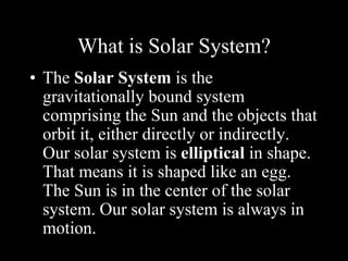 3) There are several theories for how the Solar System formed, with the most widely accepted being the Nebular Hypothesis where a large cloud collapsed and spun to form a disk that condensed into planets.