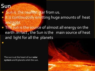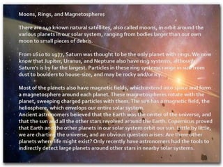 The document provides information about the planets and other objects in our solar system. It begins by listing the planets in order from the Sun: Mercury, Venus, Earth, Mars, Jupiter, Saturn, Uranus, Neptune. It then provides more detailed information about each planet, including their composition, features, orbits and other characteristics. It also mentions asteroids, dwarf planets, and the overall formation and composition of the solar system.