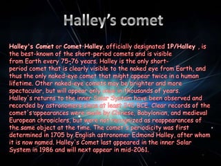 3. The official designation of Halley's comet is 1P/Halley. It was last seen in the inner Solar System in 1986 and will next appear in mid-2061.
