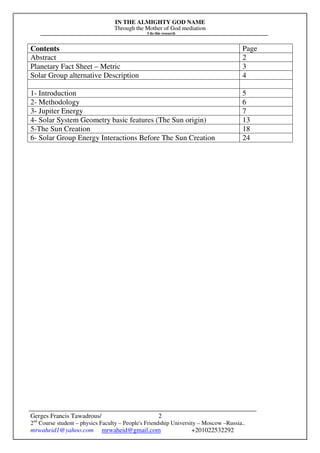 3) Jupiter plays a central role, with its diameter determining the total diameter of all planets and its energy owning the main energy of the solar system. Equations are presented showing relationships between Jupiter and Saturn.