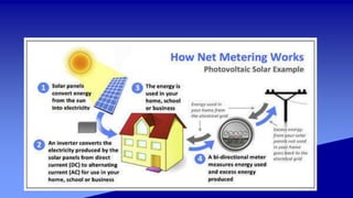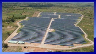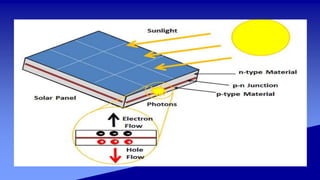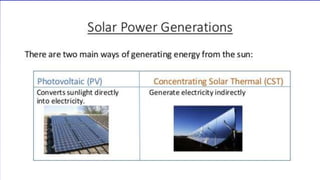 Solar power plants can generate electricity either directly using photovoltaic cells or indirectly using concentrated solar power that heats a liquid to power steam turbines. Concentrated solar power systems use lenses or mirrors to focus sunlight and heat a liquid for steam generation. Photovoltaic cells convert sunlight directly into electricity through the photovoltaic effect. Solar power has advantages of no fuel costs or pollution but higher initial costs than other technologies.
