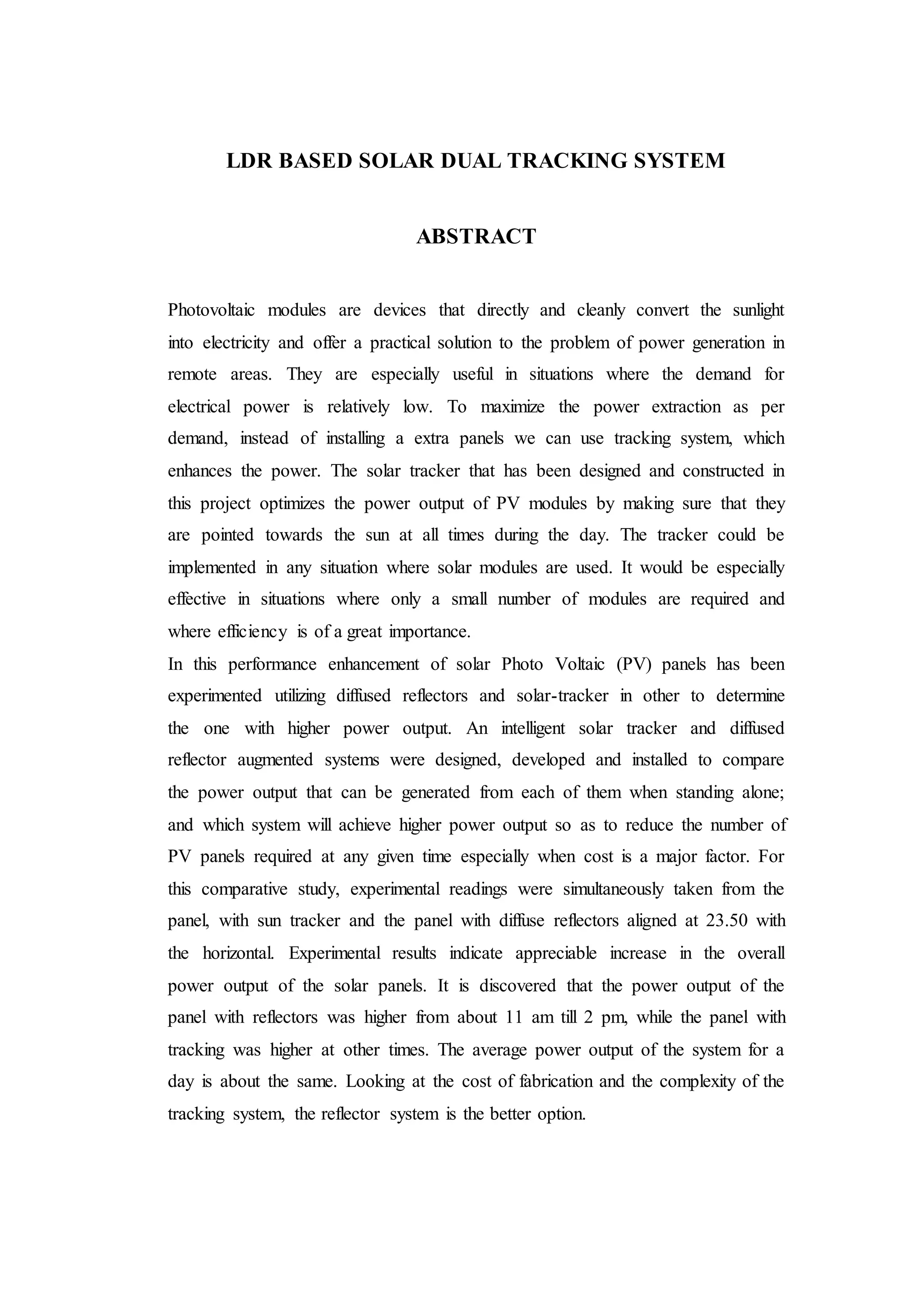 The document describes a solar tracking system that uses LDR sensors and a microcontroller to optimize the power output of solar panels. It discusses how single-axis and dual-axis trackers work to keep the panels oriented towards the sun throughout the day. Experimental results showed that a dual-axis active tracker increased power output compared to fixed panels, while a passive tracker using reflectors performed nearly as well at lower cost. The system aims to maximize solar energy collection with a low-cost design.