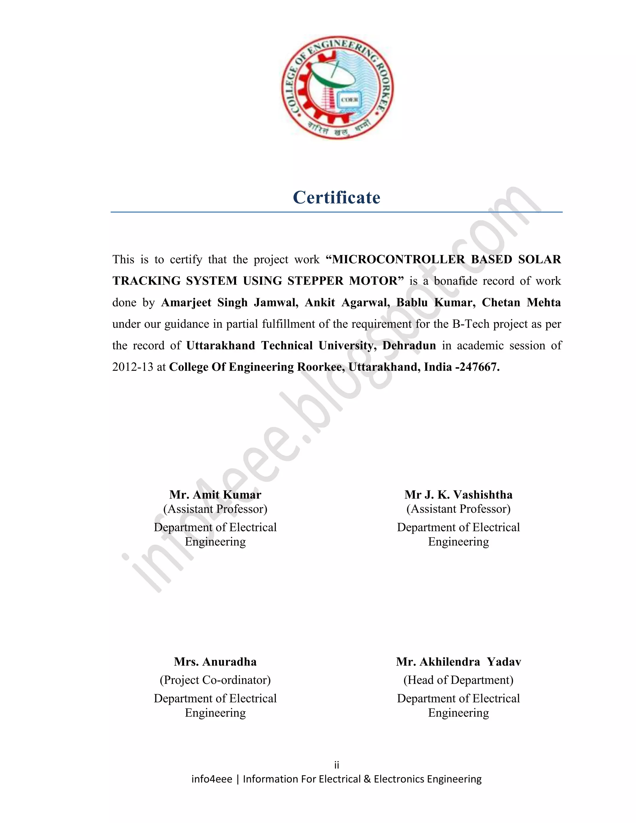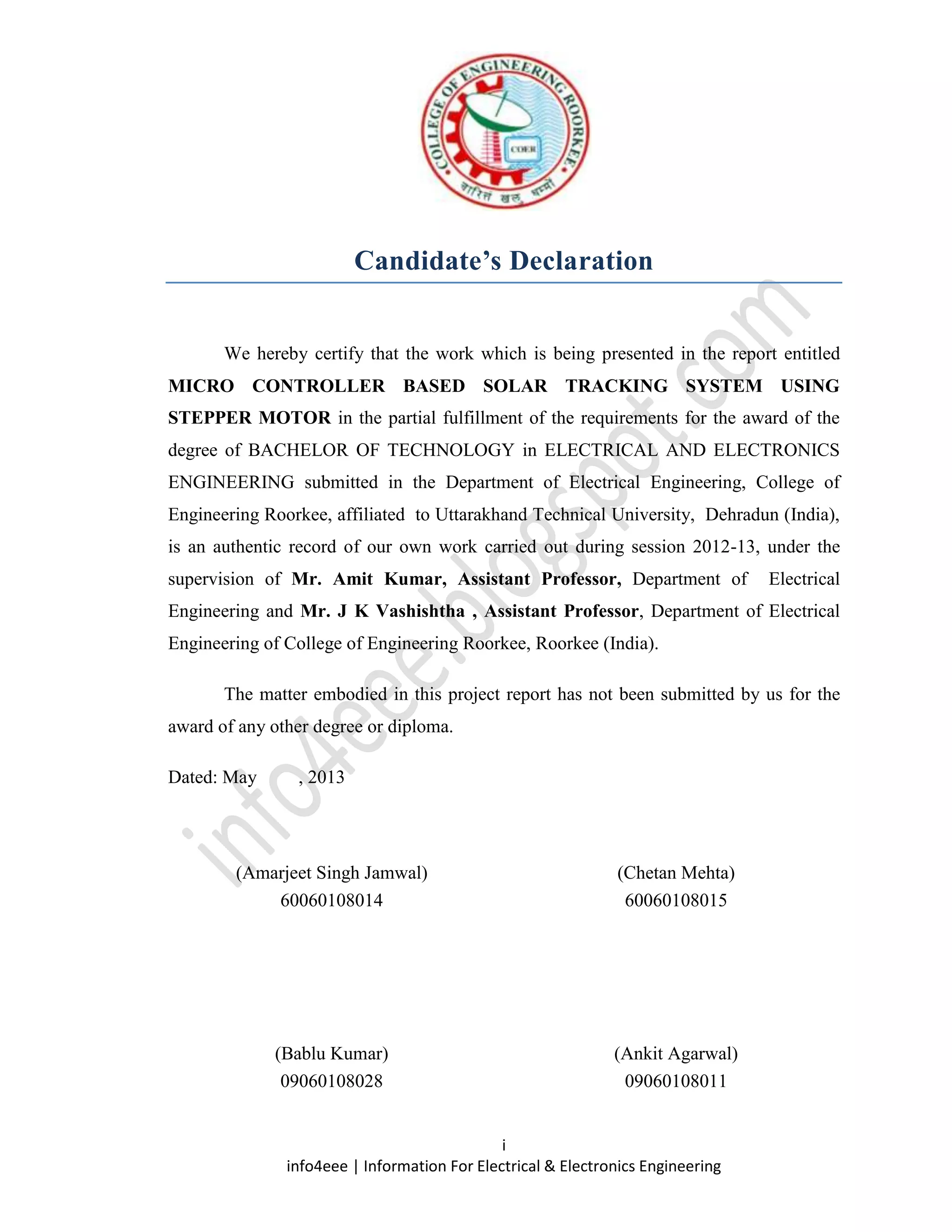This document contains a candidate's declaration signed by four students certifying that the work presented in their report titled "MICRO CONTROLLER BASED SOLAR TRACKING SYSTEM USING STEPPER MOTOR" was completed by them under supervision. It also includes certificates signed by two professors confirming the students completed the project work. The document provides an acknowledgement thanking those who assisted and supported the project work.