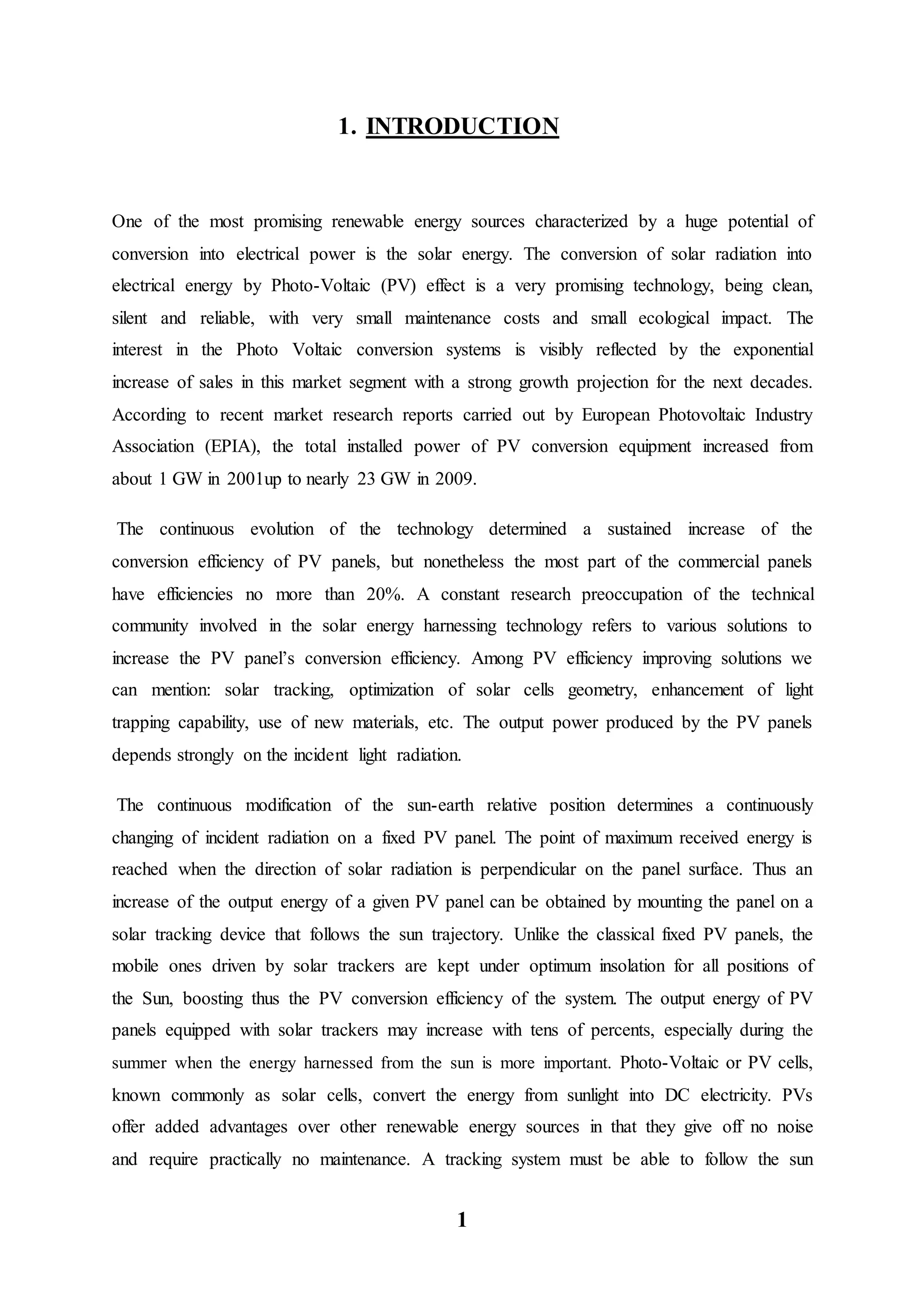2. It provides background on solar energy technology, including the components of solar tracking systems like sensors, motors, and controllers. The evolution of solar tracking from fixed panels to mobile systems is examined, noting tracking can increase energy output by tens of percent.