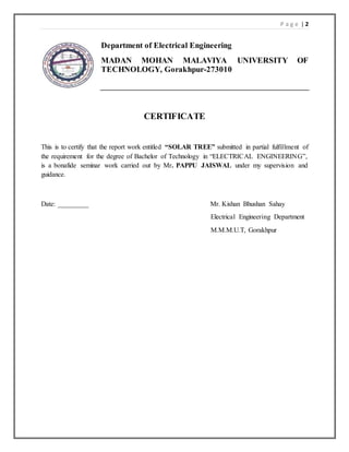 This document is a seminar report submitted by Pappu Jaiswal to fulfill requirements for a Bachelor of Technology degree in Electrical Engineering at Madan Mohan Malaviya University of Technology. The report is about solar trees and includes chapters on the working principle of solar cells, the manufacturing process of solar cells, and applications, advantages, and disadvantages of solar trees. It was supervised by Mr. Kishan Bhushan Sahay of the Electrical Engineering department.
