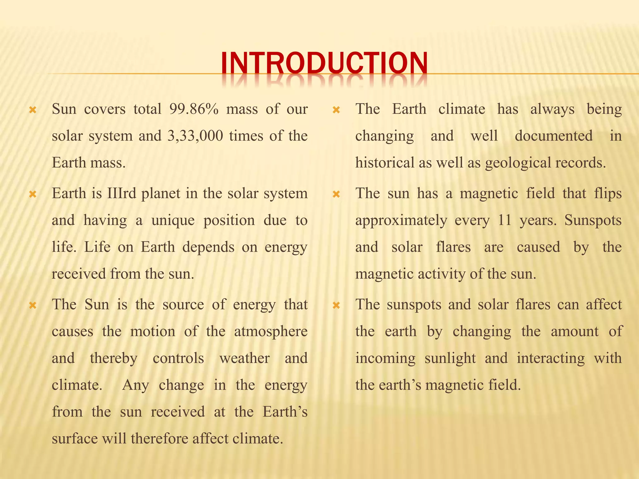 This document discusses the relationship between solar variation and climatic changes. It introduces that the sun provides the energy that drives Earth's climate and any changes in the sun's output can affect the climate. It then covers topics like how solar variation is measured, records of past solar activity, the relationship between solar activity and historical climate changes like the Little Ice Age, and conclusions that the climate appears to be highly sensitive even to small changes in solar irradiance.