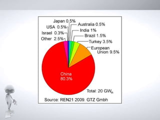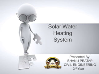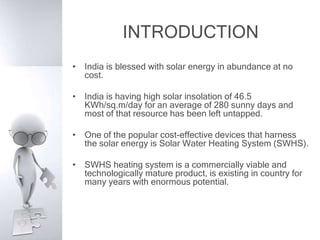 Solar water heating systems (SWHS) harness solar energy to heat water and are a cost-effective alternative to using electricity or fossil fuels for water heating. SWHS have been used in many countries since the early 1900s and became widespread in places like Israel in the 1950s due to restrictions on fossil fuel use. India receives high levels of solar radiation and SWHS can provide a suitable alternative for water heating across the country, helping save energy costs and reduce environmental degradation. The Indian government has implemented various policies and incentives to promote the adoption of SWHS.