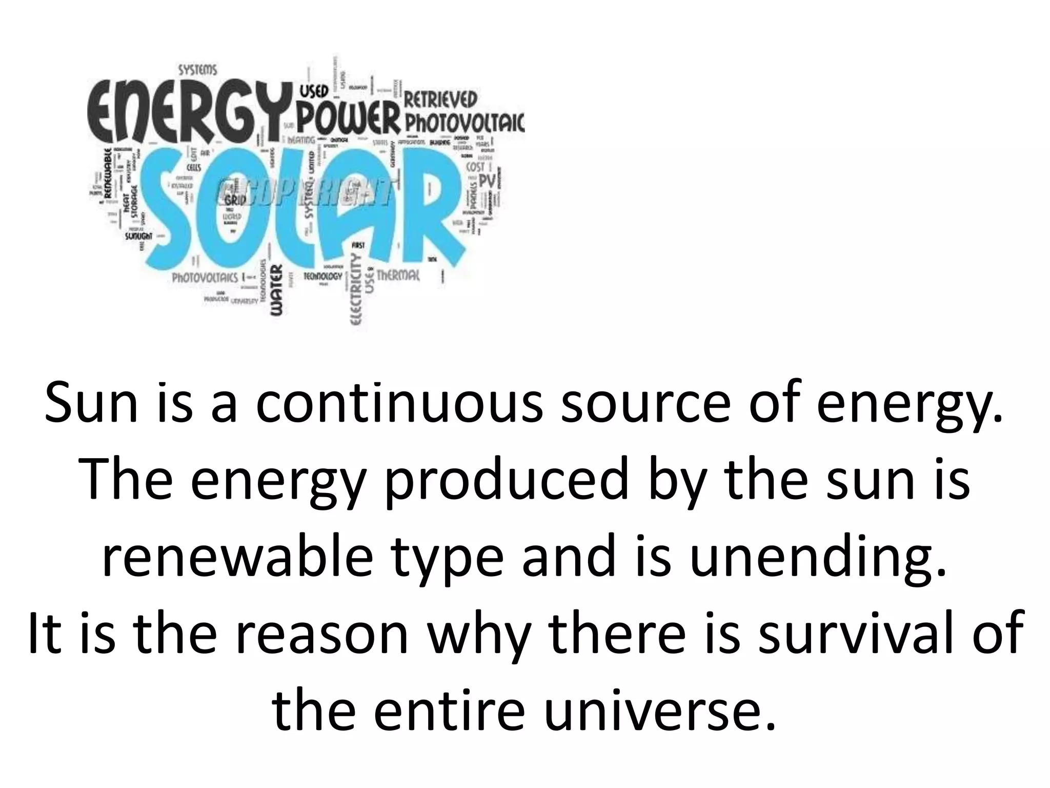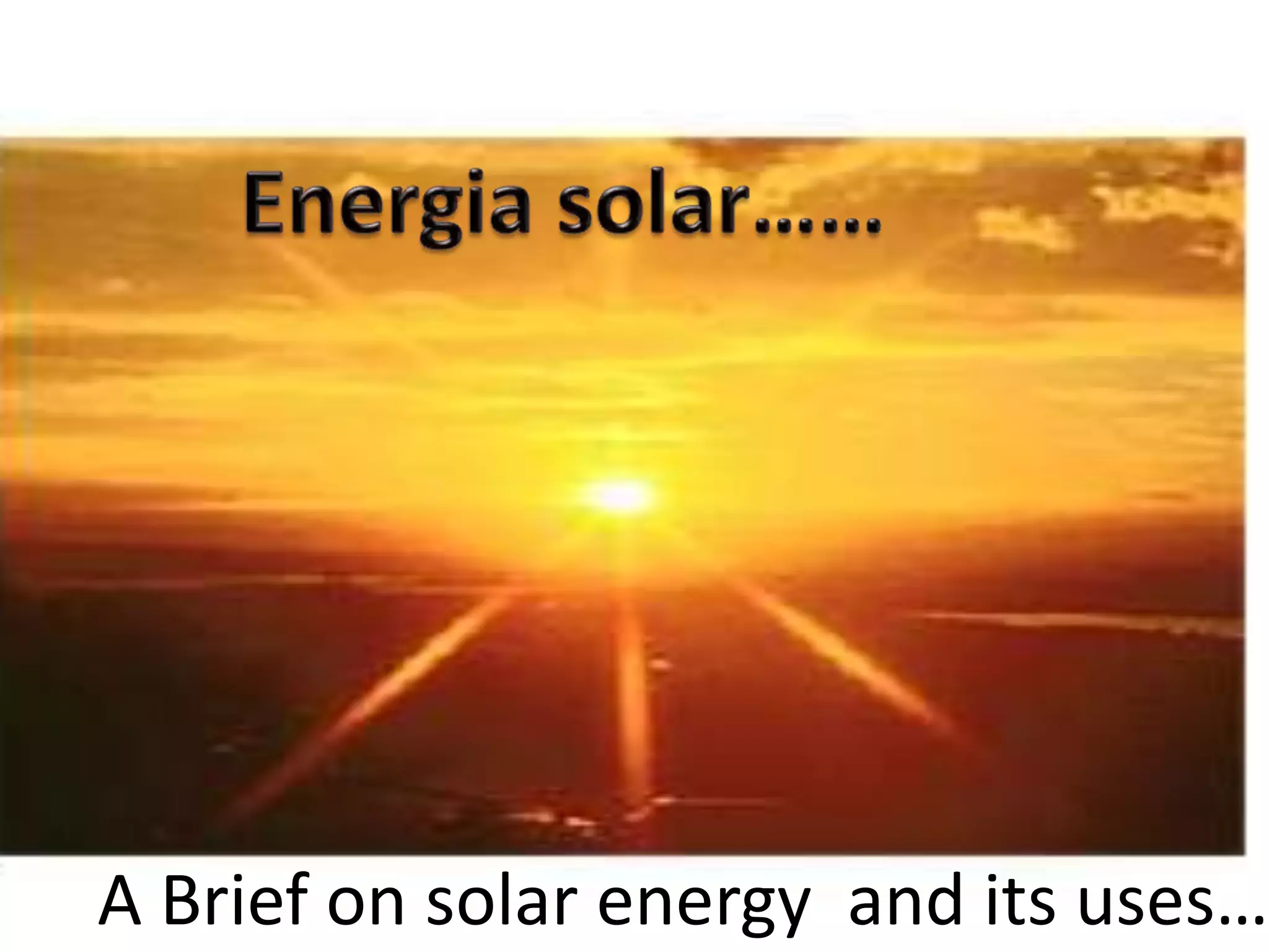 The document discusses solar energy and its uses. It notes that the sun is a continuous source of renewable energy that powers life on Earth. Solar energy is transmitted via radiation and can be harnessed using solar cells, which convert sunlight into usable electrical energy. The key components of a solar cell are the photovoltaic effect in silicon semiconductors that generate electricity when struck by photons. Connecting multiple solar cells together in an array increases the voltage output to usable levels. Solar energy systems have significant advantages as they produce no pollution or greenhouse gases.