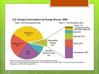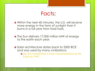 The document discusses solar energy as a natural, renewable resource. It notes that within 40 minutes, the U.S. receives more energy from the sun than it burns from fossil fuels in a year. While solar architecture dates back thousands of years, common myths have prevented more widespread adoption of solar power, such as the ideas that solar power is expensive or not viable at night. However, the document explains that solar panels can power modern homes and appliances, and net metering allows excess solar power to be supplied to homes from the electric grid.
