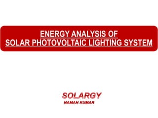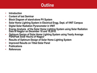 The document discusses the energy analysis and optimal design of a solar home lighting system in Nagpur, India. Key points: