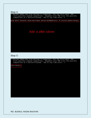 This document provides instructions for resetting a forgotten root password on a Solaris 10 server. It outlines booting the server from the CD-ROM and then 15 steps for resetting the password, concluding by rebooting the server after completing the steps. The author's name, MD. Budrul Hasan Bhuhiyan, is repeated between the sections.