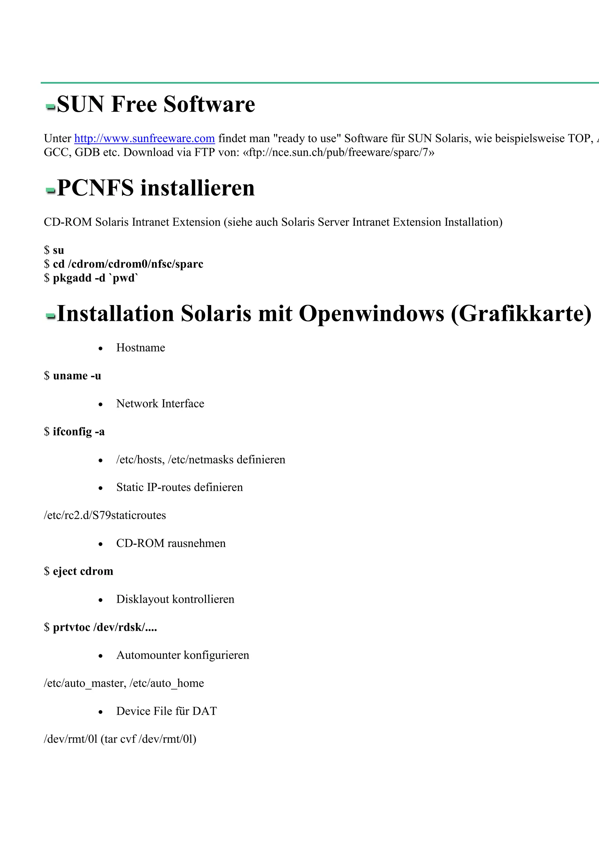This document provides instructions for various system administration tasks on Sun Solaris systems, including: