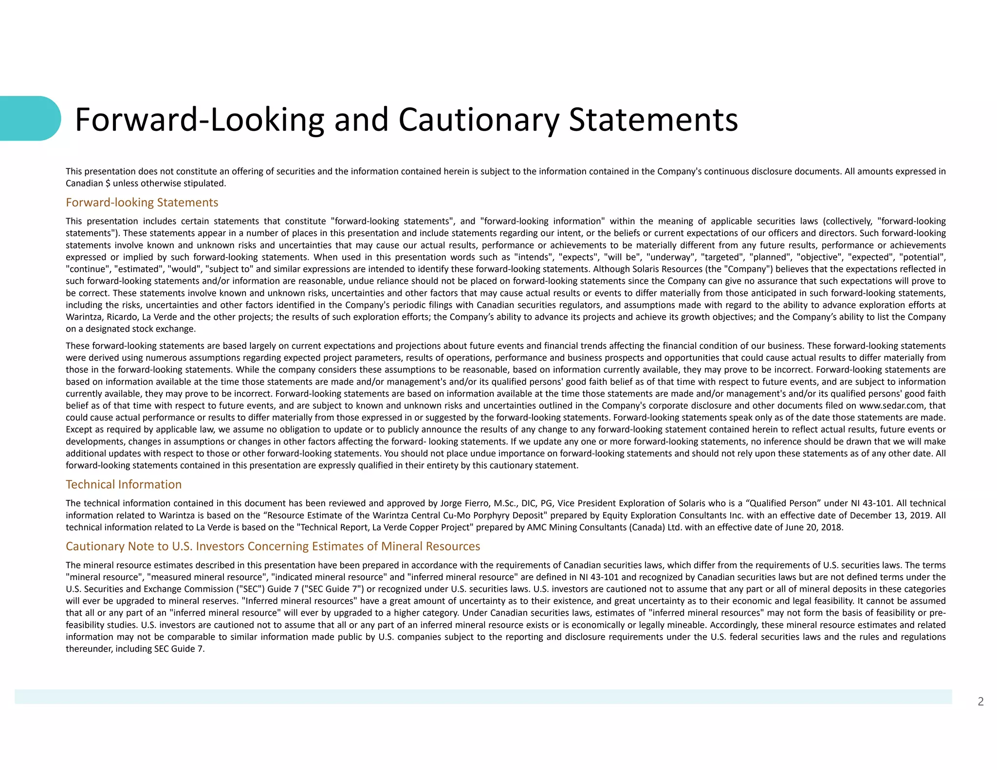 This presentation summarizes Solaris Resources' portfolio of copper and gold projects in the Americas. Solaris is focused on advancing its flagship high-grade Warintza copper project in Ecuador through drilling programs, with the goal of multiple-times resource expansion and discovery potential. Solaris also has exploration projects in Chile and Peru that it believes offer discovery potential. The company aims to leverage its projects through drilling to drive resource growth and discoveries, and is managed by the experienced Augusta Group with a track record of value creation through past mining exits and mergers.