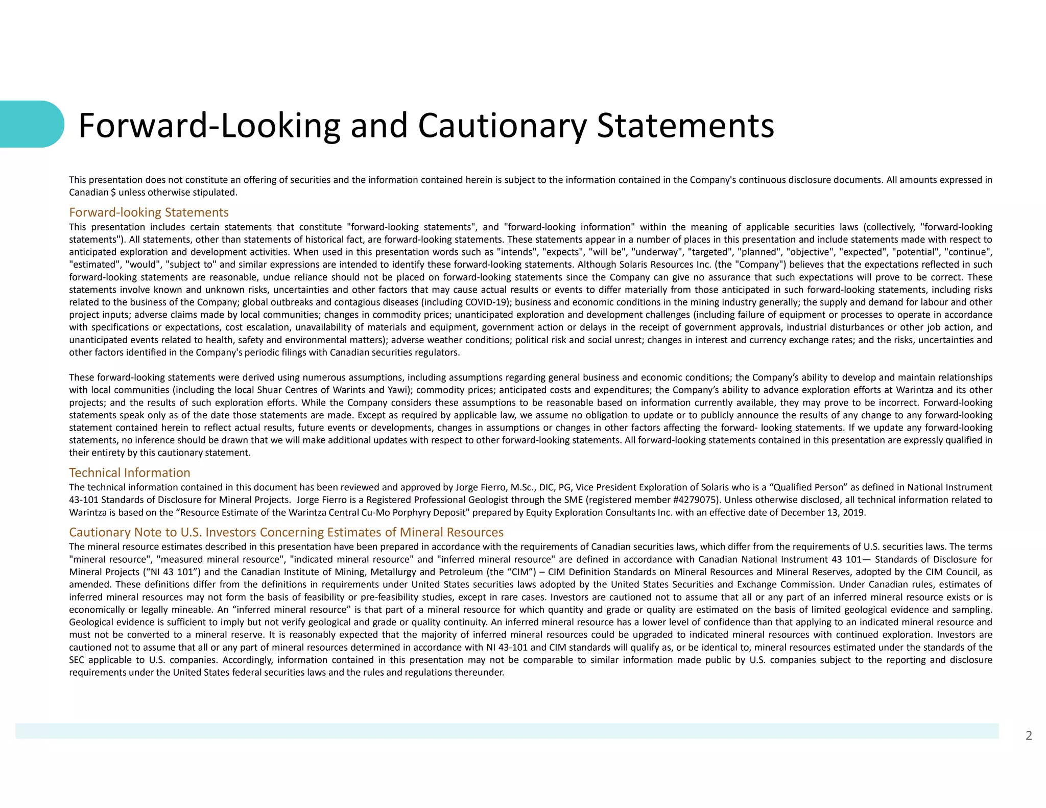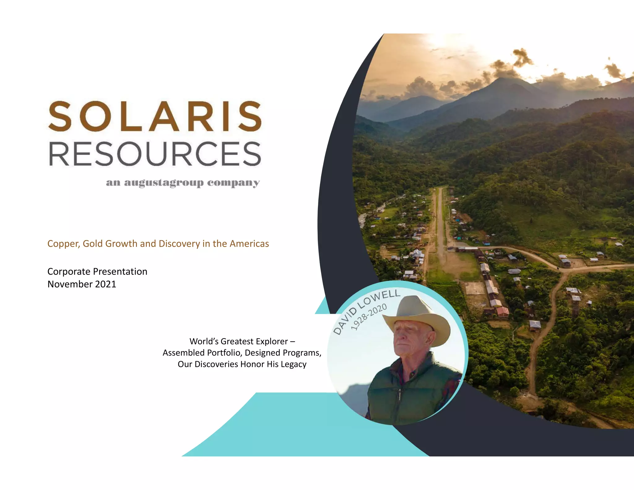 This corporate presentation from Solaris Resources provides an overview of the company's copper and gold portfolio in the Americas. Solaris' flagship project is the high-grade Warintza copper project in Ecuador, which has an open pit resource within a large area with potential for further discoveries. The company is also exploring earlier stage projects in Chile and Peru for further discovery potential. Solaris' exploration programs are designed by David Lowell and led by Jorge Fierro, VP Exploration, to leverage drilling for multiple resource growth and discovery opportunities across the portfolio.