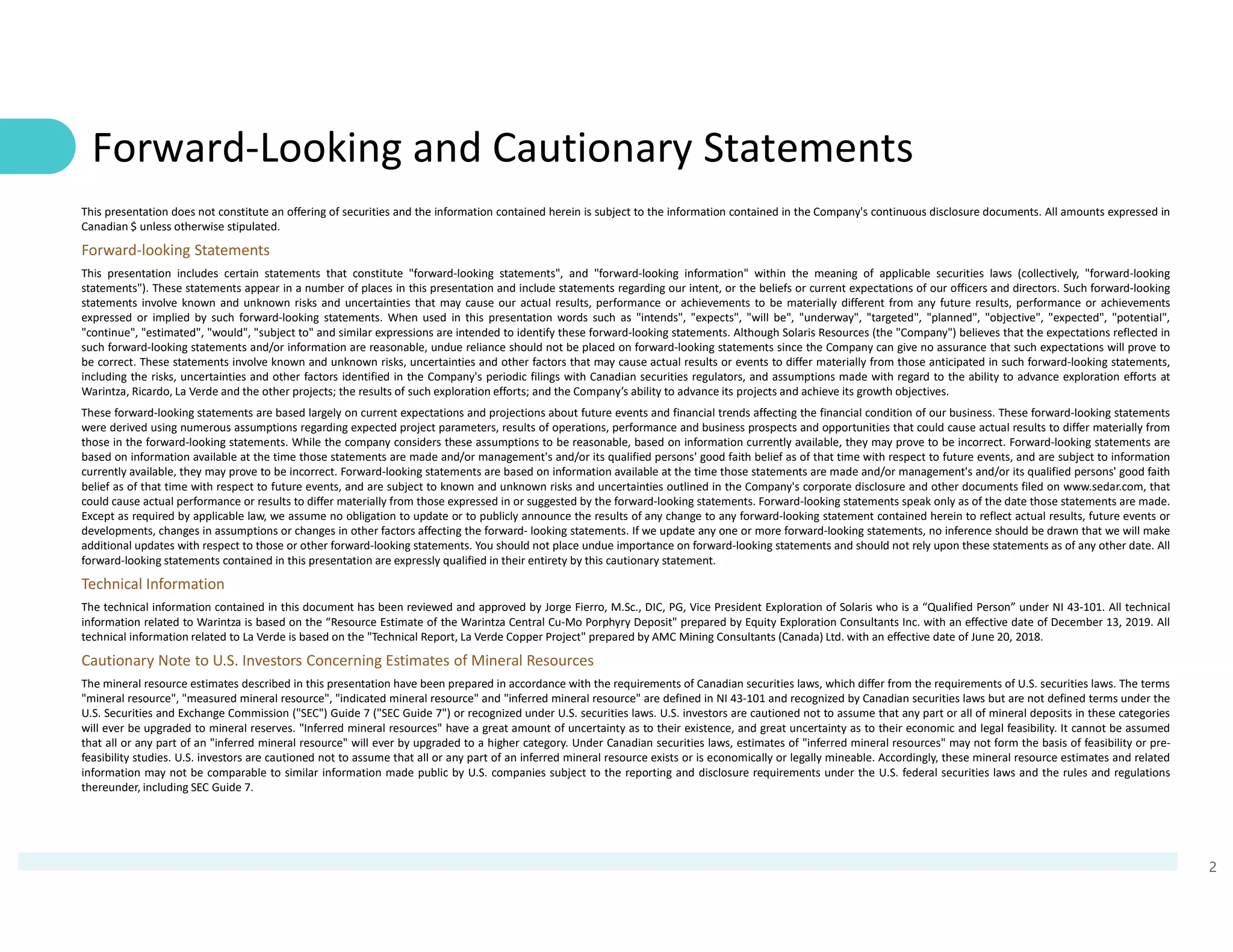 The presentation summarizes Solaris Resources' portfolio of copper and gold assets in the Americas, with a focus on its flagship Warintza project in Ecuador. Warintza has an in-pit inferred resource of 124Mt at 0.7% CuEq and remains open laterally and at depth. Solaris has begun a 40km drilling program at Warintza to extend mineralization and test other porphyry targets along a 5km trend of outcropping copper porphyries. The company aims to advance its projects responsibly while providing benefits to local communities and stakeholders.